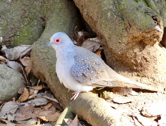 名前の由来にもなっている、翼のひとつひとつの羽にある白い斑点が、まるではかなく舞う薄雪のように見えるのが大きな特徴です。また、ぱっちりとした目の周りにある鮮やかな赤いアイリングも、ウスユキバトのチャームポイントとして知られています。